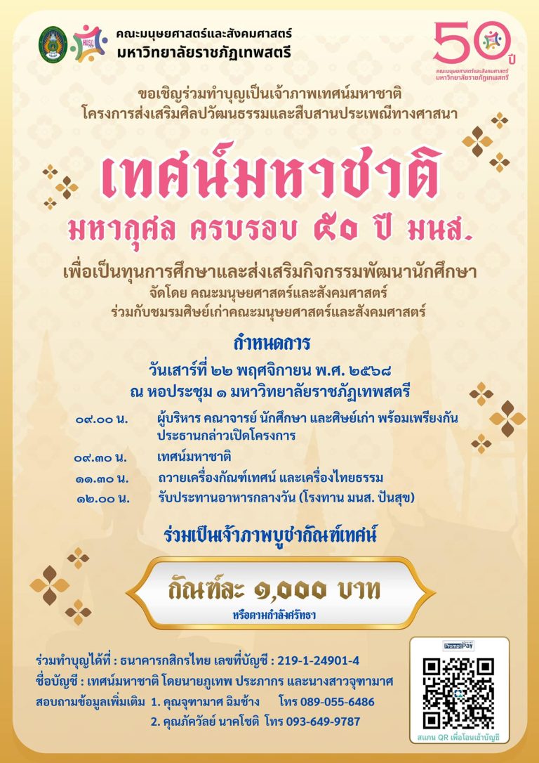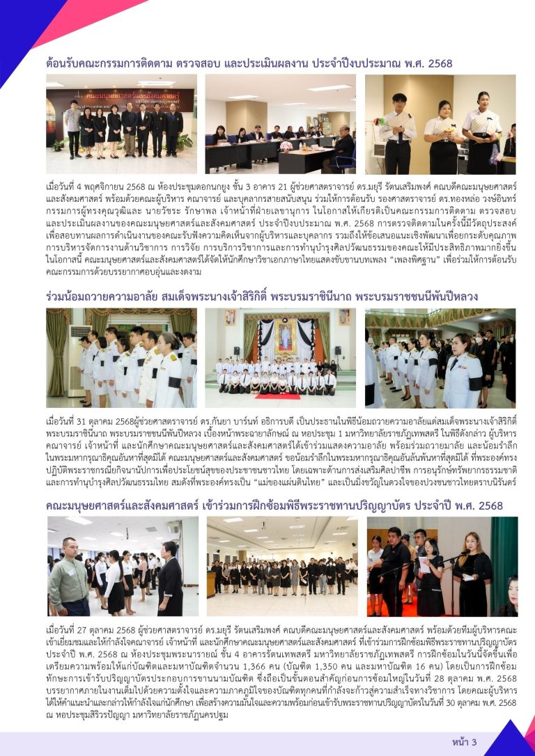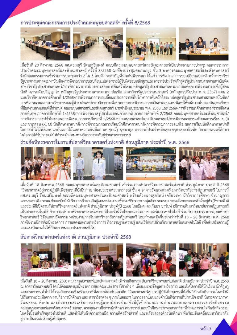 ผศ.ดร.ภูเทพ ประภากร รองคณบดีฝ่ายวิชาการและวิจัย คณะมนุษยศาสตร์และสังคมศาสตร์ มหาวิทยาลัยราชภัฏเทพสตรี เป็นประธานในการประชุมหัวหน้าภาควิชา หัวหน้าสาขาวิชา และคณะกรรมการทวนสอบมาตรฐานผลสัมฤทธิ์ทางการเรียน คณะมนุษยศาสตร์และสังคมศาสตร์ ครั้งที่ 11/2568 เมื่อวันที่ 14 พฤศจิกายน พ.ศ. 2568 ณ ห้องประชุมดอกนกยูง ชั้น 3 อาคารคณะมนุษยศาสตร์และสังคมศาสตร์ โดยมีคณะกรรมการเข้าร่วมประชุมมากกว่าสองในสามของจำนวนกรรมการทั้งหมดสำหรับวาระสำคัญในการประชุม ประกอบด้วยการพิจารณาให้ความเห็นชอบการขอแก้ไขผลการเรียนในกรณีขาดสอบ (X และ M) และ ร (I)การพิจารณาให้ความเห็นชอบผลการเรียนนักศึกษา ดูใน facebook อ่านในเว็บไซต์มหาวิทยาลัย
